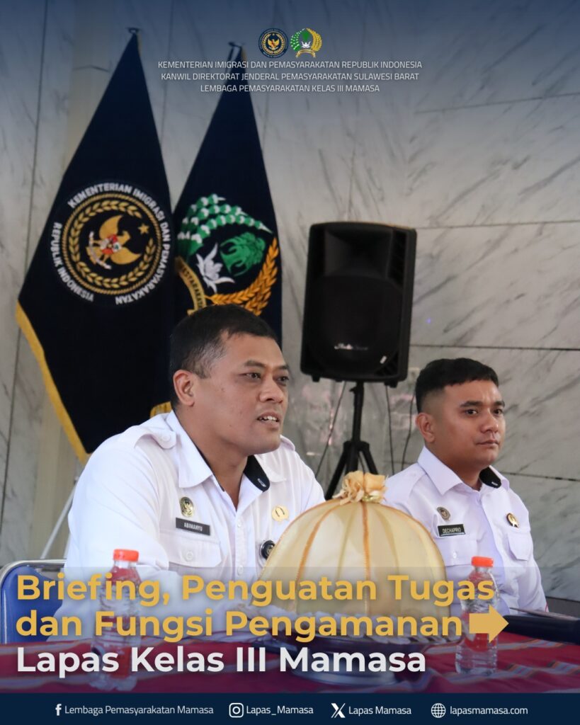 Briefing, Penguatan Tugas dan Fungsi Pengamanan Lapas Kelas III Mamasa Kegiatan briefing penguatan tugas dan fungsi pengamanan di Lapas Kelas III Mamasa diselenggarakan sebagai upaya strategis untuk menyelaraskan pemahaman personel terhadap prosedur operasional yang berlaku. Pimpinan menekankan pentingnya profesionalisme, kedisiplinan, serta penerapan langkah-langkah preventif untuk menjaga stabilitas dan ketertiban di lingkungan pemasyarakatan. Selain penyampaian arahan, […]
