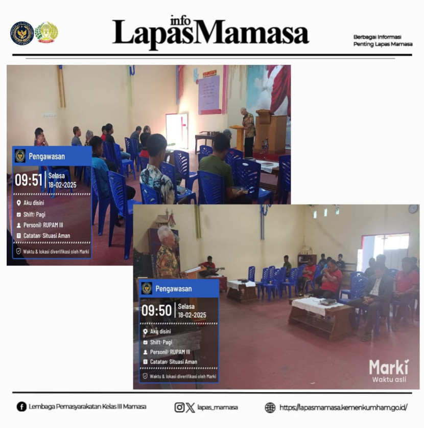 Mamasa, 19 Februari 2025 – Lembaga Pemasyarakatan (Lapas) Kelas III Mamasa terus berkomitmen dalam memberikan pembinaan kepribadian kepada warga binaan, salah satunya melalui kegiatan ibadah bersama bagi warga binaan yang beragama Kristen. Kegiatan ini dilaksanakan secara rutin melalui kerja sama dengan Penyuluh Agama Kristen dari Kantor Kementerian Agama Kabupaten Mamasa.