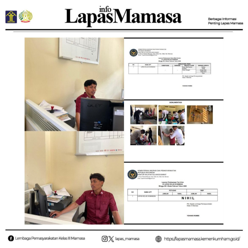 Mamasa, 21 Februari 2025 – Lembaga Pemasyarakatan (Lapas) Kelas III Mamasa telah menyelesaikan penginputan laporan pelaksanaan razia blok hunian dan tes urine sebagai tindak lanjut dari Surat Kepala Divisi Pemasyarakatan Kementerian Hukum dan HAM Sulawesi Barat Nomor: W.33.UM.01.01-1689 tanggal 1 November 2024. Surat tersebut menginstruksikan seluruh Lapas, Rutan, dan LPKA di wilayah Sulawesi Barat untuk melaksanakan razia serta tes urine guna memastikan kondisi keamanan dan ketertiban tetap terjaga.