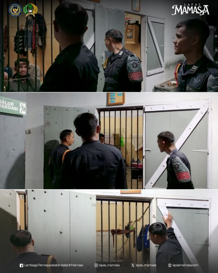Lembaga Pemasyarakatan Kelas III Mamasa terus memperkuat langkah pengamanan dengan melaksanakan patroli keliling secara rutin di blok hunian warga binaan. Pada Senin malam, 18 Agustus 2025, mulai pukul 22.00 WITA hingga selesai, petugas pengamanan yang terdiri dari Karupam IV, Wakarupam IV, serta petugas piket staf melaksanakan kontrol keliling sesuai amanat Peraturan Menteri Hukum dan HAM RI Nomor 8 Tahun 2024 tentang Penyelenggaraan Keamanan dan Ketertiban.