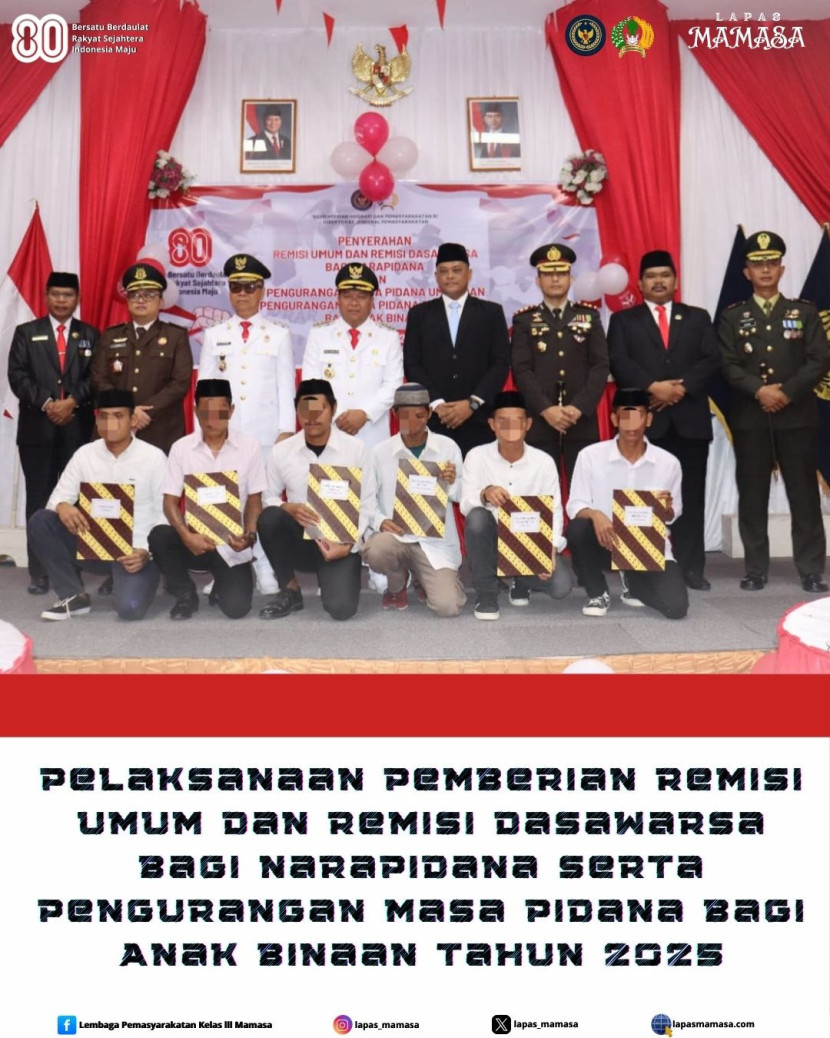 Lapas Kelas III Mamasa menyelenggarakan kegiatan pemberian Remisi Umum dan Remisi Dasawarsa bagi narapidana serta pengurangan masa pidana bagi anak binaan dalam rangka HUT ke-80 Kemerdekaan Republik Indonesia, pada Minggu, 17 Agustus 2025. Kegiatan ini merupakan tindak lanjut dari pedoman yang ditetapkan Direktorat Jenderal Pemasyarakatan, sebagai bentuk penghargaan negara atas pencapaian pembinaan yang telah dijalani oleh narapidana dan anak binaan.