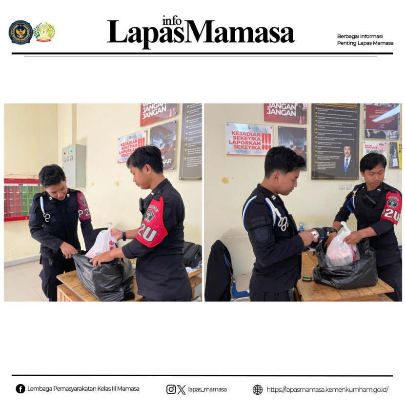 Mamasa, 24 Februari 2025 – Dalam upaya mencegah peredaran barang berbahaya dan barang terlarang di dalam Lembaga Pemasyarakatan (Lapas) Kelas III Mamasa, petugas pengamanan secara rutin melaksanakan pemeriksaan barang bawaan warga binaan. Kegiatan ini bertujuan untuk memastikan keamanan dan ketertiban di dalam lingkungan Lapas Mamasa.