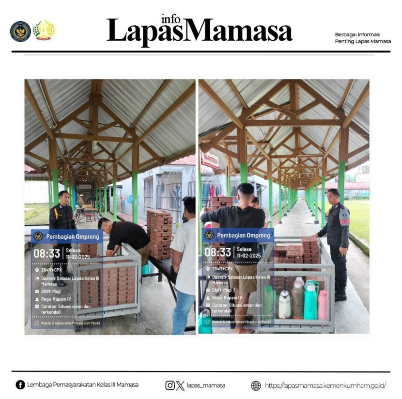 Mamasa, 12 Februari 2025 – Petugas Lembaga Pemasyarakatan (Lapas) Kelas III Mamasa terus berkomitmen dalam memastikan layanan bagi warga binaan tetap berjalan sesuai dengan standar yang berlaku. Salah satu upaya yang dilakukan adalah pengawasan ketat terhadap proses pembagian makanan bagi warga binaan.