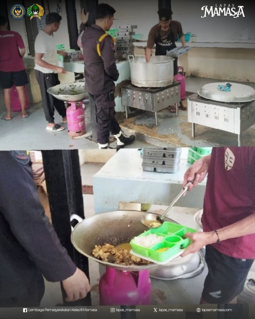 Dalam rangka memastikan kualitas dan keamanan makanan bagi Warga Binaan Pemasyarakatan (WBP), Lapas Kelas III Mamasa secara rutin melaksanakan kegiatan pengawasan ketat di area dapur. Kegiatan ini meliputi pengecekan bahan makanan, proses pengolahan, hingga penyajian akhir. Petugas dapur bersama tim pengawas melakukan kontrol menyeluruh terhadap kebersihan lingkungan dapur, alat masak, serta cara penyimpanan bahan mentah, demi menjamin makanan yang disajikan memenuhi standar kesehatan dan kebersihan.