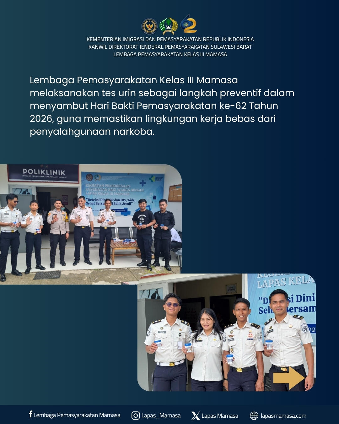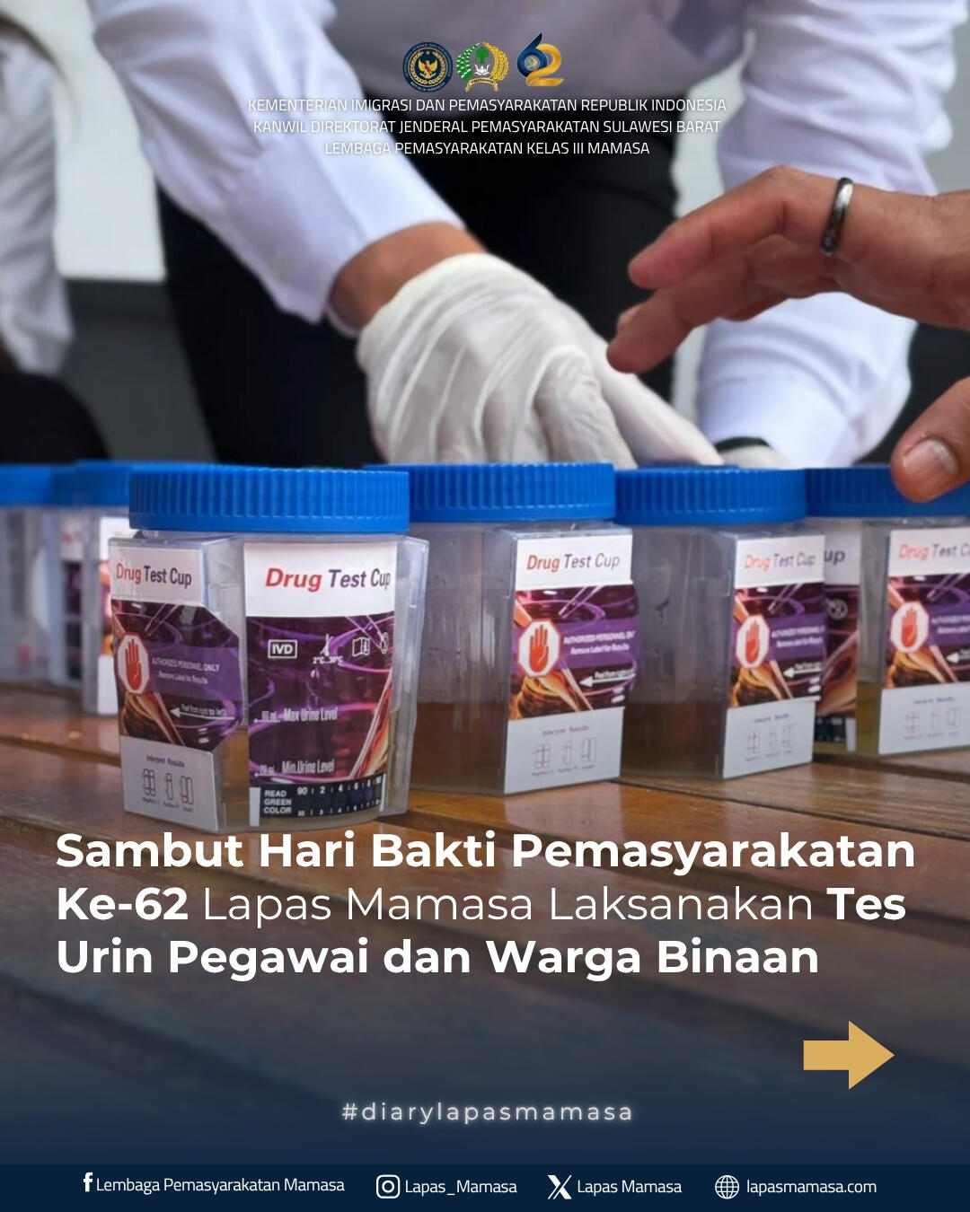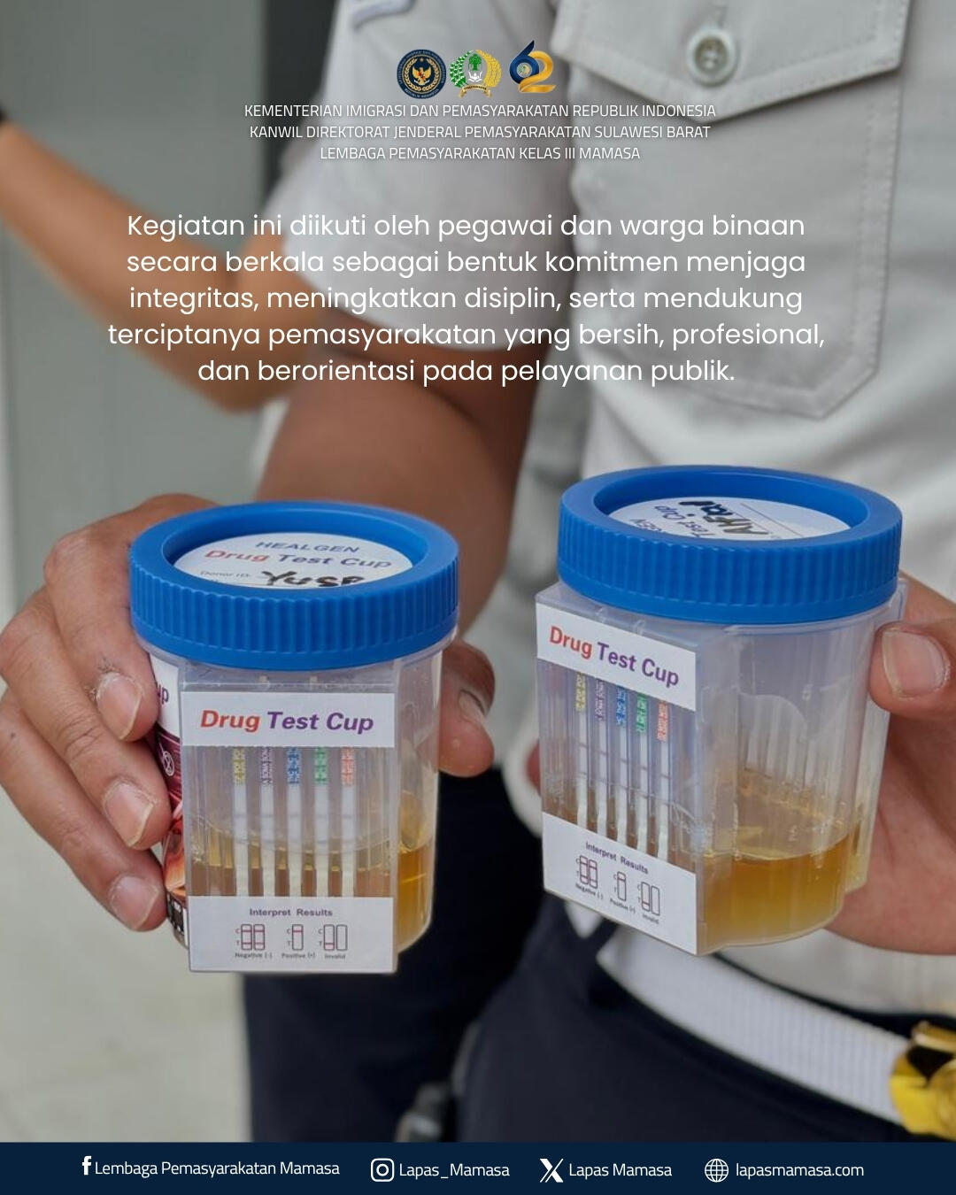 Mamasa — Dalam rangka menyambut Hari Bakti Pemasyarakatan ke-62 Tahun 2026, Lembaga Pemasyarakatan Kelas III Mamasa melaksanakan kegiatan tes urin kepada pegawai dan Warga Binaan Pemasyarakatan (WBP). Kegiatan ini merupakan langkah nyata dalam mencegah dan mendeteksi dini penyalahgunaan narkoba di lingkungan lapas.