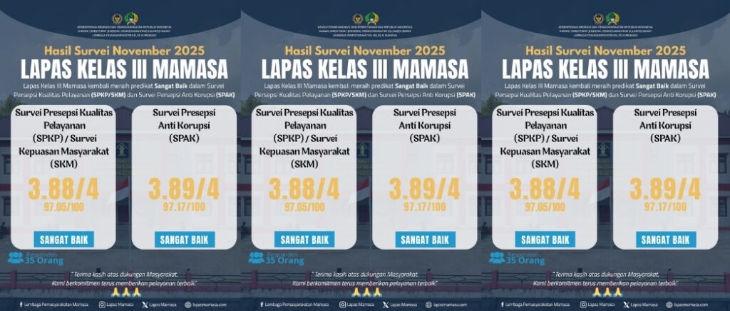 Berikut Hasil Survei Presepsi Kualitas Pelayanan (SPKP)/Survei Kepuasan Masyarakat (SKM) dan Survei Presepsi Anti Korupsi (SPAK) pada Lembaga Pemasyarakatan Kelas III Mamasa Periode Bulan November 2025 yang menunjukkan Predikat Sangat Baik. Terima kasih atas partisipasi dan dukungan Masyarakat, Kami terus berkomitmen memberikan pelayanan terbaik. #kementerianimigrasidanpemasyarakatan #Kemenimipas #DirektoratJenderalPemasyarakatan #DItjenpas #menteriimigrasidanpemasyarakatan #Menimipas #AgusAndrianto #KanwilDitjenpasSulbar #RamdaniBoy #Abimanyu #LapasMamasa #diarylapasmamasa