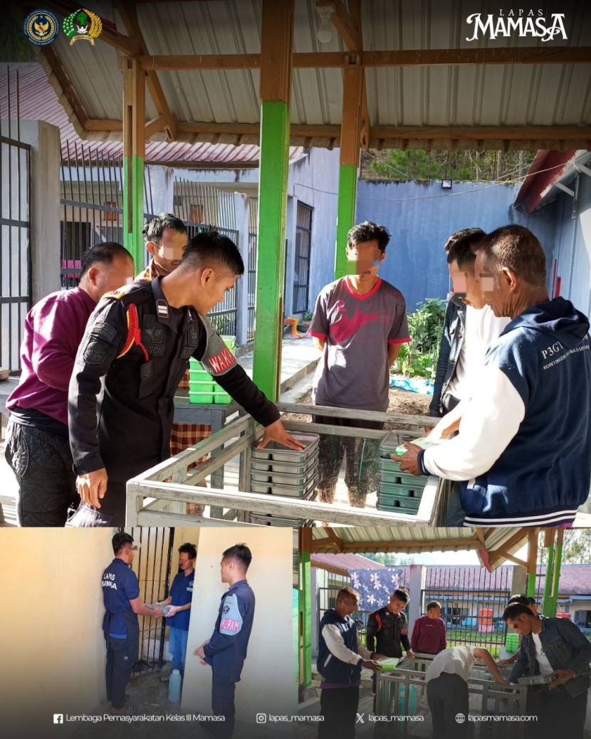 Setiap hari, kegiatan pembagian makanan kepada warga binaan di Lapas Kelas III Mamasa berlangsung dengan sistem yang tertib dan teratur. Proses distribusi makanan, yang dikenal dengan sebutan “pembagian ompreng,” dilakukan secara langsung oleh petugas dapur, dengan pengawasan ketat dari petugas jaga. Warga binaan menerima jatah makanan sesuai porsinya masing-masing, dalam suasana tertib dan terorganisir.